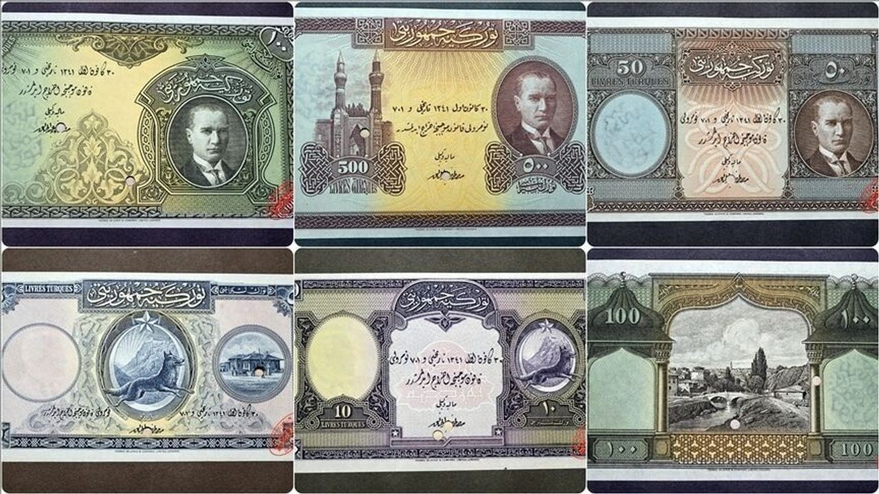 Harf Devrimi öncesi basılan 1. emisyon paralar, üzerlerindeki farklı fotoğraflarla dikkati çekiyor. 1 Türk lirasının ön yüzünde 1. TBMM Binası, Ankara Kalesi ve kara sabanla çift süren bir köylünün fotoğrafı yer alırken, arka yüzünde eski başbakanlık binası bulunuyor. 5 liranın ön yüzünde kurt figürü, arka yüzünde ise Ankara'nın Yenimahalle ilçesinde bulunan ve 1922 yılında Anadolu Selçuklu sultanlarından I. Alaeddin Keykubad adına Kızılbey tarafından yaptırılan Akköprü yer alıyor. 10 liranın önünde kurt figürü, arkasında Ankara Kalesi'nden bir kare bulunuyor. 100 liranın ön yüzünde Atatürk portresi, arka yüzünde ise Anadolu'dan bir köy resmi kullanılıyor. 500 liranın önünde Sivas Gök Medrese, dış yüzünde ise Sivas'tan genel bir fotoğraf yer alıyor. Banknotların en büyüğü olan 1000 lirada ise ön yüzünde hilal içerisinde Atatürk portresi, dış yüzünde Sakarya demir yolu hattı bulunuyor.Para basma yetkisi TCMB'ye geçiyor