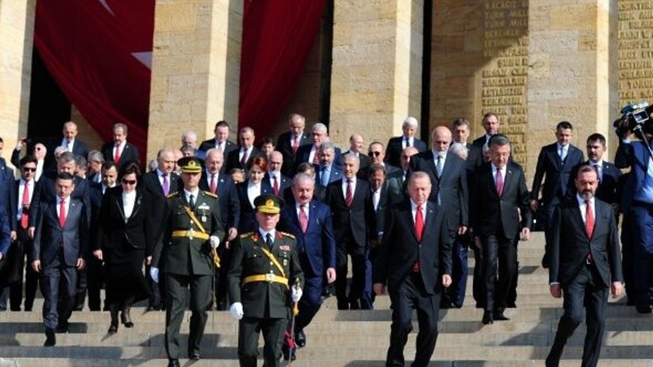 Heyet, Aslanlı Yol`dan geçerek, Atatürk`ün mozolesine geldi. Erdoğan`ın, üzerinde ay yıldız bulunan çelengi Atatürk`ün mozolesine bırakmasının ardından saygı duruşunda bulunuldu ve İstiklal Marşı okundu.