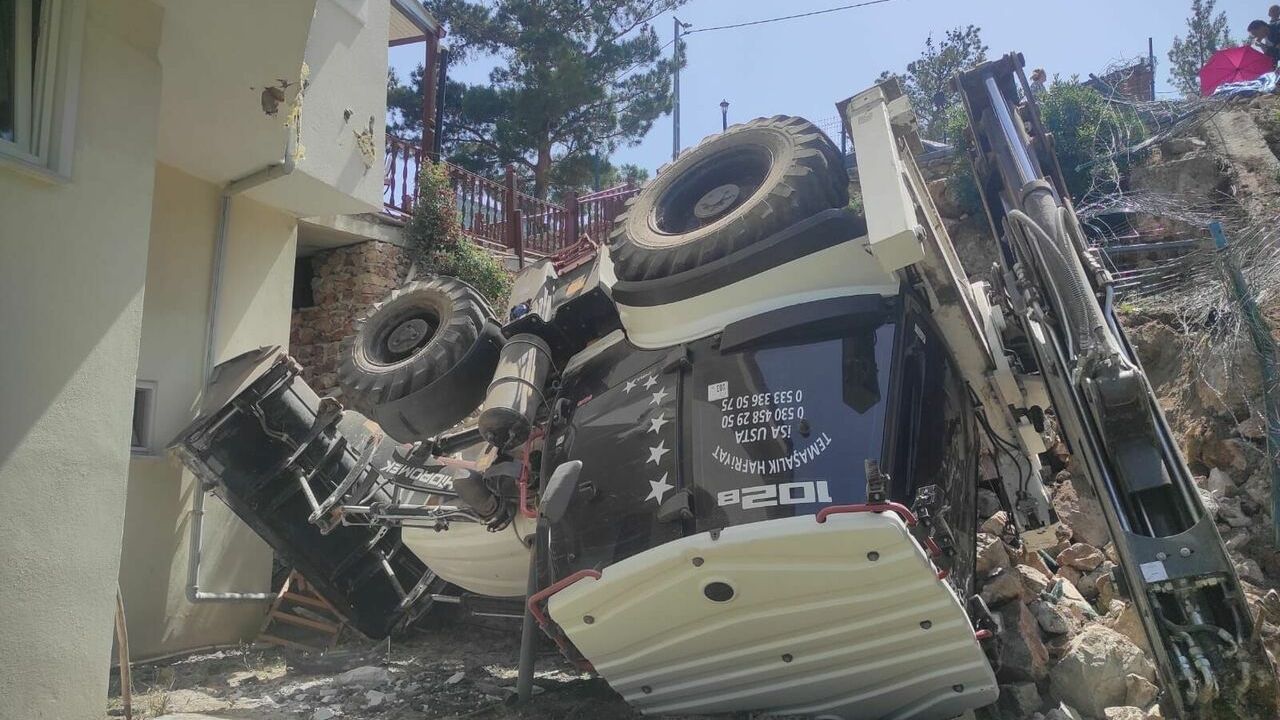 İlçeye bağlı kırsal Kocadağ Mahallesi'nde sürücüsünün kimliği öğrenilemeyen kepçe, inşaat alanındaki çalışma sırasında henüz bilinmeyen nedenle devrildi.