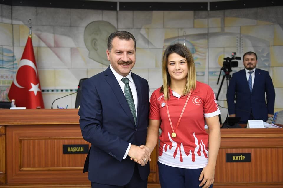 Büyükşehir Belediye Meclisi’nin toplantısına davet edilen Dünya Şampiyonu Judocu Habibe Afyonlu’ya altın ve çeşitli hediyeler takdim edildi. Büyükşehir Belediye Başkanı Yücel Yılmaz, Habibe Afyonlu’nun başarısını kutlayarak
