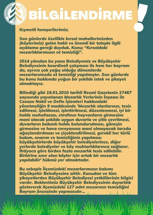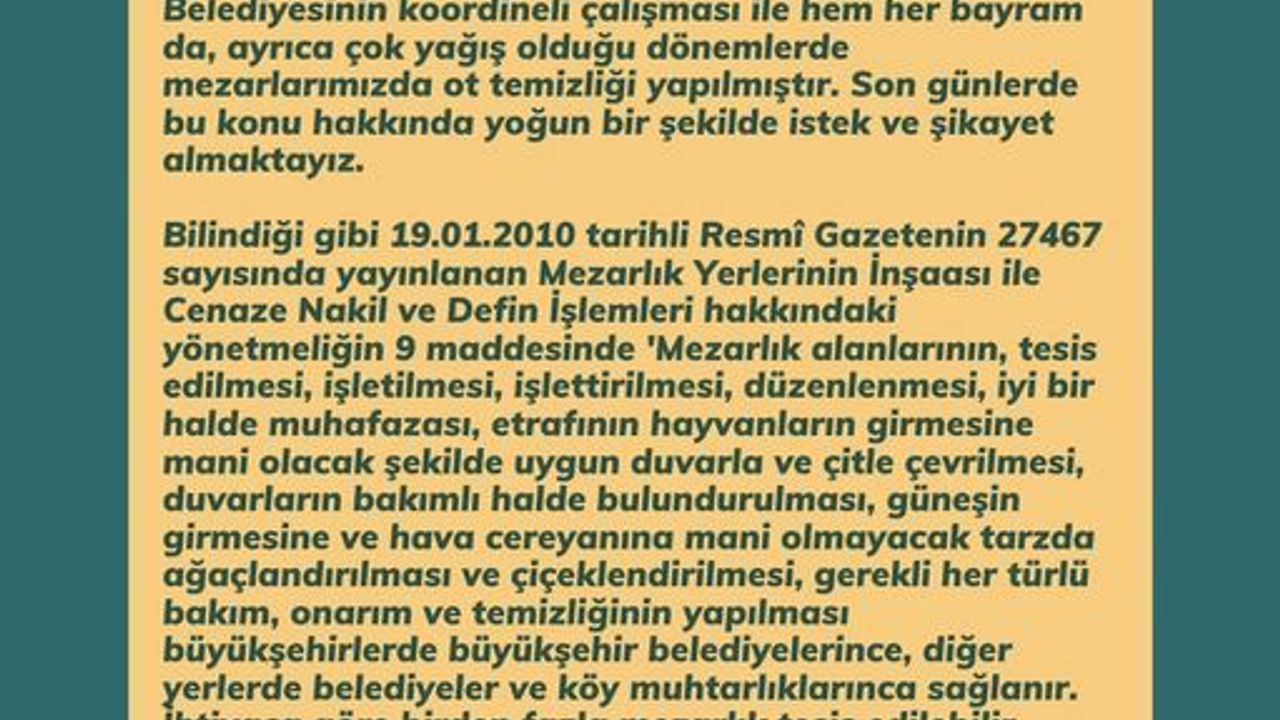“Son günlerde özellikle kırsal mahallerimizden (köylerimiz) gelen haklı ve önemli bir taleple ilgili açıklama gereği duyduk. Konu; “Kırsaldaki mezarlıklarımızın ot temizliği”. 2014 yılından bu yana Belediyemiz ve Büyükşehir Belediyesinin koordineli çalışması ile hem her bayram da, ayrıca çok yağış olduğu dönemlerde mezarlarımızda ot temizliği yapılmıştır. Son günlerde bu konu hakkında yoğun bir şekilde istek ve şikayet almaktayız.
