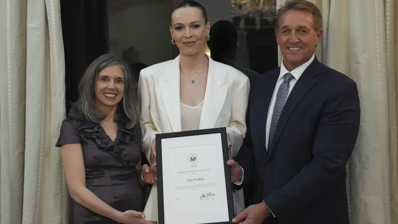 Eda Erdem Dündar'a ödüle aday gösterildiği için bir plaket takdim edilirken, Jeffry L. Flake, kadınların güçlendirilmesi konusunda Eda Erdem Dündar'ın çok önemli bir figür olduğunu söyledi.