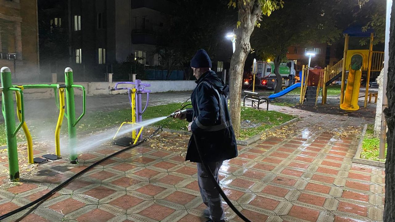 Ekipler, gün içinde komşularımızın yoğun şekilde kullandığı parkları akşam saatlerinde detaylı olarak temizliyor.