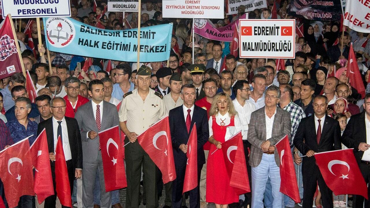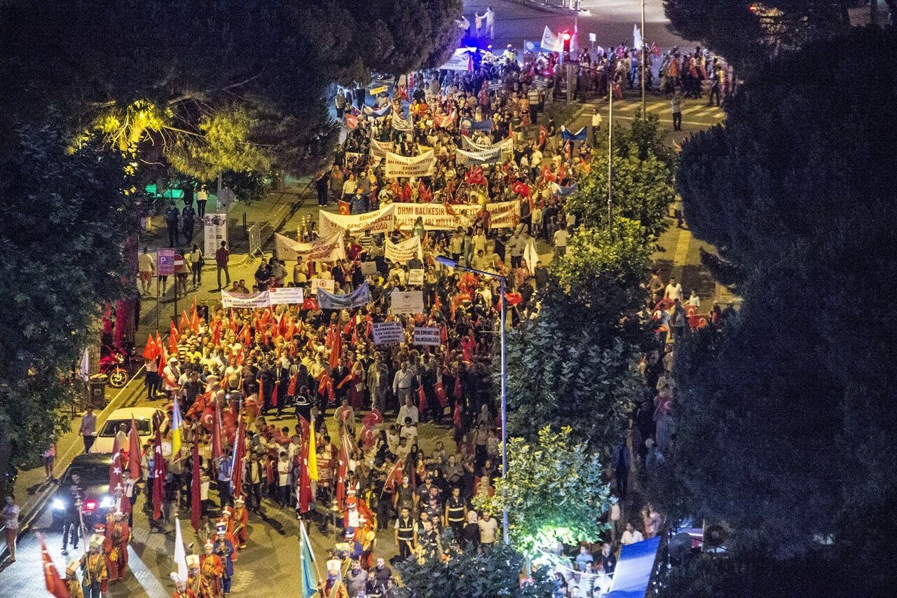 Saat 22.30’da Şehit Hamdi Bey Meydanında Edremit Kaymakamlığının çağrısı ile bir araya gelen binlerce vatandaş Azerbaycan Bulvarı, Menderes Bulvarı üzerinden Cumhuriyet Meydanına kadar yaklaşık yarım saatlik bir yürüyüş gerçekleştirdiler. Şehitleri anma yürüyüşünden sonra Cumhuriyet Meydanı’nda saygı duruşu ve İstiklal Marşı söylendi. Kur’an-ı Kerim tilavetinden sonra şiirler okundu. Mehteran gösterisi sonrasında Edremit Kaymakamı Ali Sırmalı kürsüye çıkarak “15 Temmuz 2016’da milletimize, demokrasimize karşı hain FETÖ terör örgütü tarafından darbe girişimi yapıldı. O gece alçaklar milli iradenin üzerine bombalar yağdırdı. Milli iradenin tecelli ettiği makam olan Türkiye Büyük Millet Meclisini bombaladılar. Tanklar ile halkın üzerine yürüdüler. Gözünü kırpmadan vatandaşlarımızı şehit ettiler. O kara gecede alçaklıkta, hainlikte, ihanette sınır tanımadılar. O gece Cumhurbaşkanımız Sayın Recep Tayyip Erdoğan’ın çağrısı üzerine milletimiz meydanlara indi. Tek millet, tek vatan, tek bayrak, tek devlet inancıyla birleşti. Tek yürek halinde hareket ederek milli iradenin teslim alınamayacağını gösterdiler. Türk Demokrasisine ve milli iradeye karşı teşebbüs edilen hain darbe girişimi Sayın Cumhurbaşkanımızın liderliğinde kahraman milletimiz tarafından bertaraf edildi." dedi. Konuşmanın ardından Edremit Müftülüğü hocaları tarafından ilahiler ve kasideler okundu. Saatler 00.13’ü gösterdiğinde ise tüm yurtta olduğu gibi Edremit’te de bütün camilerden Salâ’lar okundu. Etkinliklerin sonunda ise binlerce Edremitli bayrak şöleni ile Cumhuriyet Meydanını bayraklar ile coşturdular.