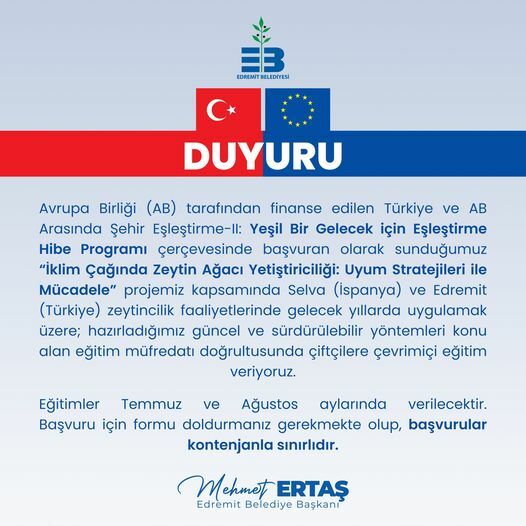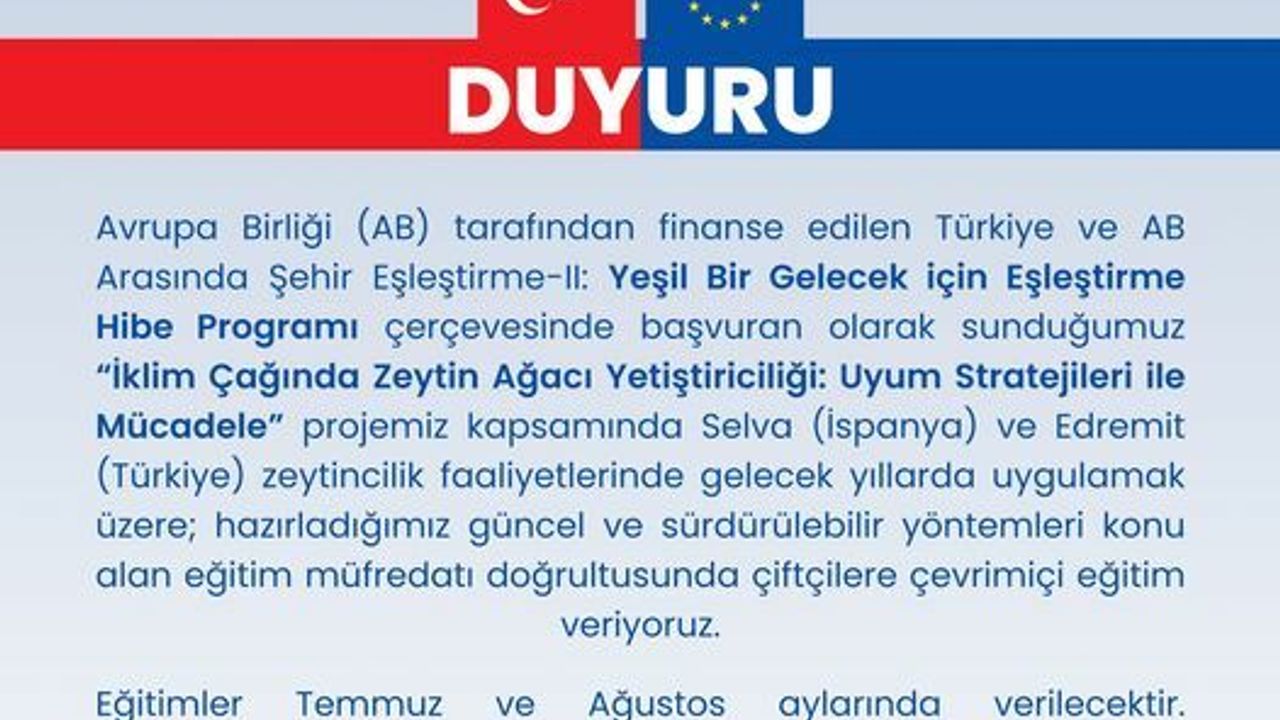 Avrupa Birliği (AB) tarafından finanse edilen Türkiye ve AB Arasında Şehir Eşleştirme-II: Yeşil Bir Gelecek için Eşleştirme Hibe Programı kapsamında Edremit Belediyesi'nin sunduğu “İklim Çağında Zeytin Ağacı Yetiştiriciliği: Uyum Stratejileri ile Mücadele” projesiyle zeytin çiftçileri için önemli bir eğitim fırsatı sunuluyor.