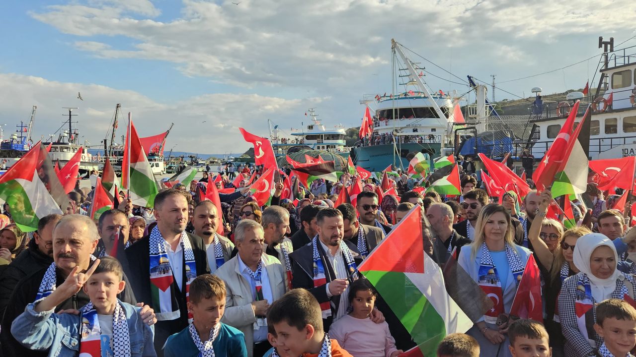 Katılımcılar, ellerinde Türk ve Filistin bayraklarıyla Gazze halkına destek mesajları verdi. Limanda, duygu dolu anlar yaşandı.