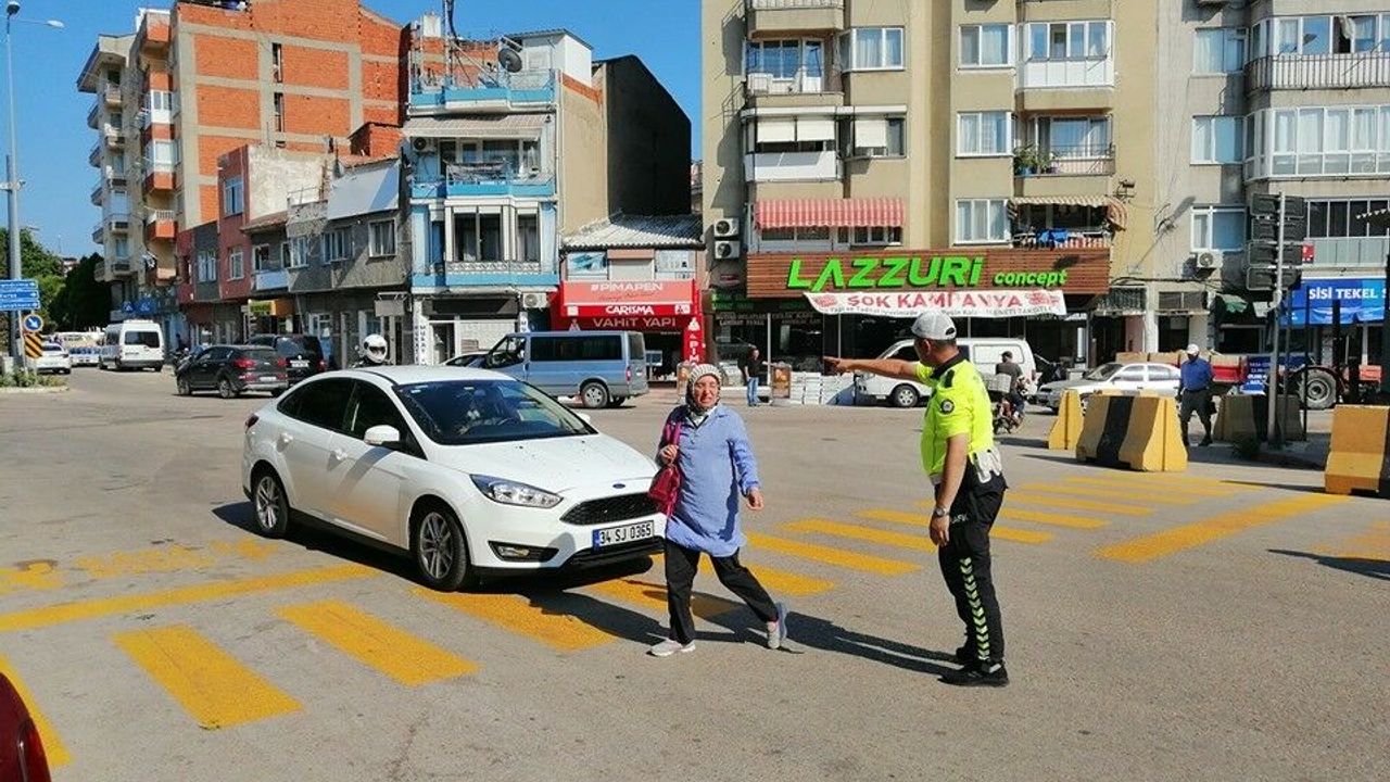 Erdek'te polis ekipleri yaya geçitlerinde öncelik uygulaması yapılırken, yayalara yol vermeyen araç sürücülerine ceza yağdırdı.