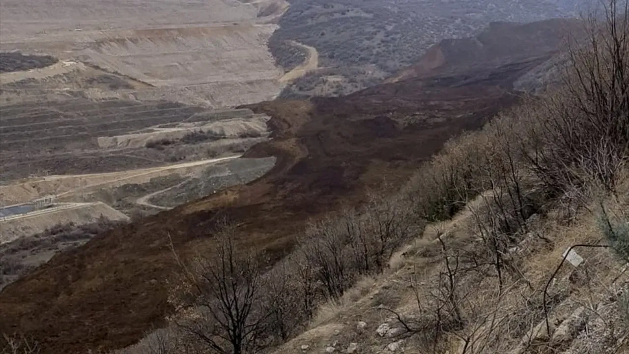 Erzincan'ın İliç ilçesinde toprak kaymasının meydana geldiği maden ocağı bölgesi dronla görüntülendi. Çöpler köyündeki altın madeninin bulunduğu bölgede dün meydana gelen toprak kayması sonucu kaybolan 9 işçinin bulunması için başlatılan arama kurtarma çalışmaları sürüyor.