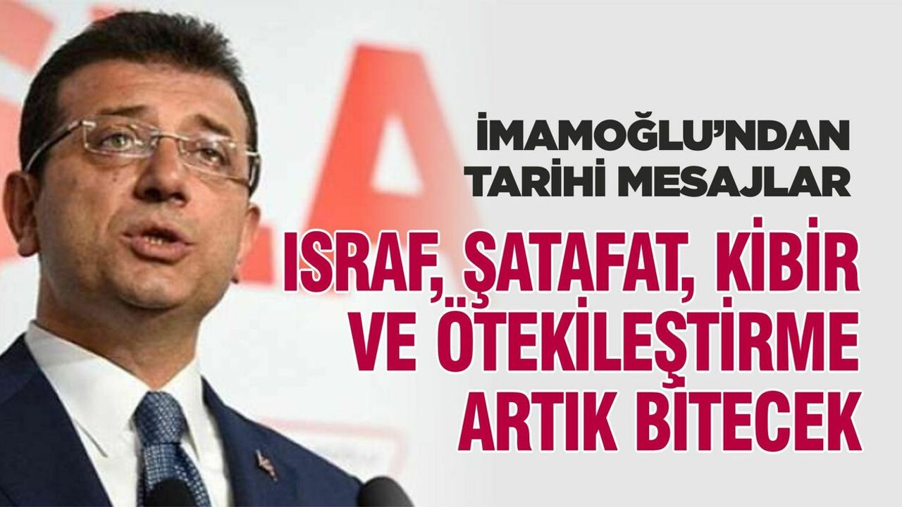 ÖTEKİLEŞTİRME BİTECEKBu yeni sayfada İstanbul’da artık adalet eşitlik sevgi hoşgörü olacak, ısraf, şatafat, kibir ve ötekileştirme bitecek. Bugün 16 milyon İstanbullu demokrasiye olan inancımızı, adalete olan güvenimizi tazelemiştir. Bunu bana oy verenler değil, seçimleri büyük bir olgunlukla geçiren tüm vatandaşlarımız sağlamıştır. Her birine yürekten teşekkür ediyorum. Halkımıza, minnet duygularımı iletiyorum. Sizler Türkiye’nin demokrasi itibarını tüm dünyanın gözleri önünde korudunuz. Türkiye’yi yakın coğrafyadaki bazı ülkelere benzetme gayretinde olanlara da işin aslını öğrettiniz. Yüz yılı aşan demokrasi geleneğine sahip çıktınız.