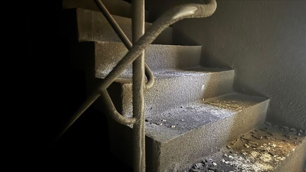 Üzerinde kül kalıntıları olan merdivenlerde, ayrıca elektrik kabloları da bulunuyor.
