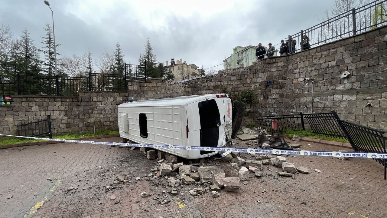 6 metrelik istinat duvarından aşağı düşen servis aracında büyük çapta maddi hasar meydana gelirken, polis ekipleri kazanın meydana geldiği sokakta geniş güvenlik önlemleri aldı. Aracın el freninin mi boşaldığı yoksa mekanik bir arıza mı yaşandığı yapılacak teknik incelemenin ardından netlik kazanacak