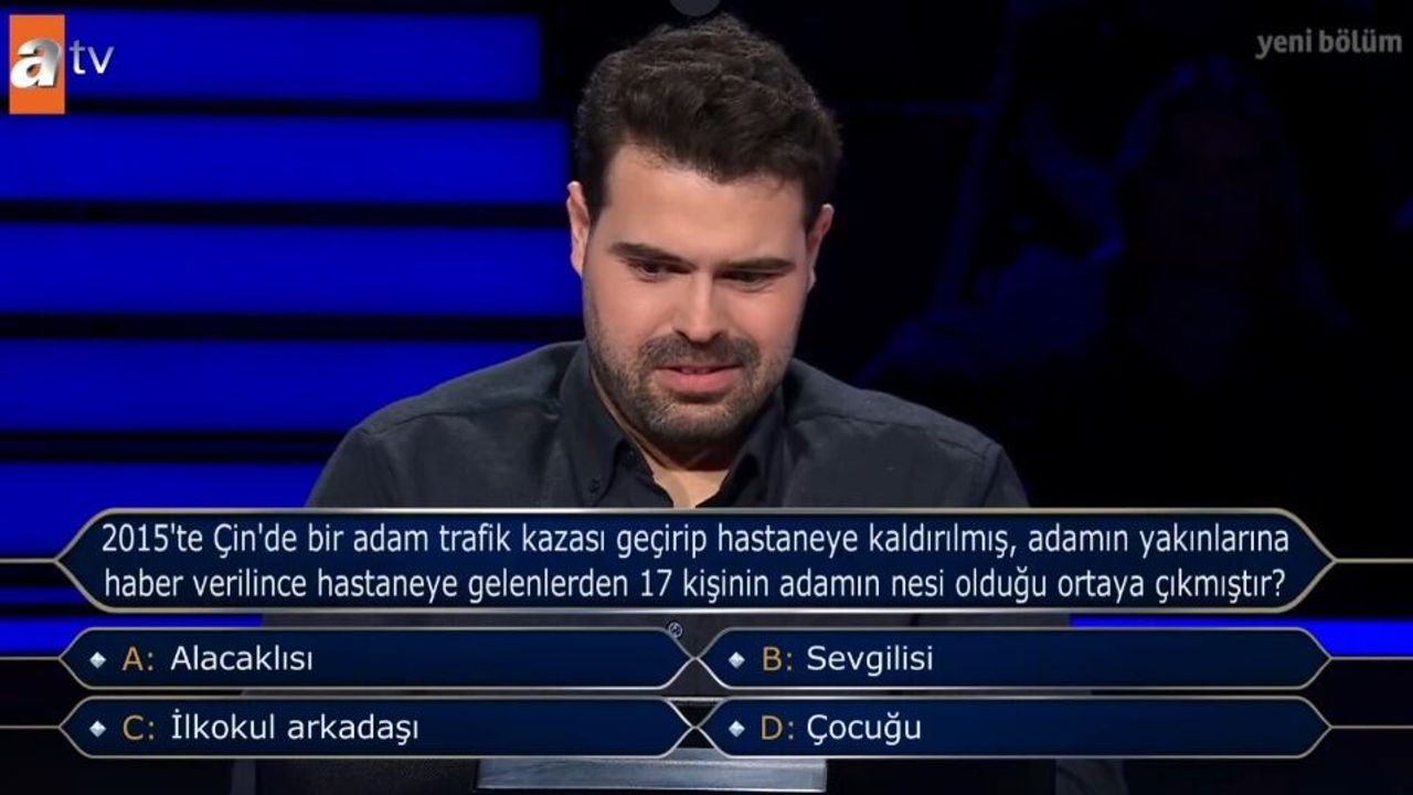 Yarışmacının karşısına çıkan soruda, Çin'de geçirdiği bir kaza sonrası hastaneye kaldırılan bir adamın, kendisini ziyarete gelen yakınlarıyla ilgili ortaya çıkan trajikomik gerçek soruldu.