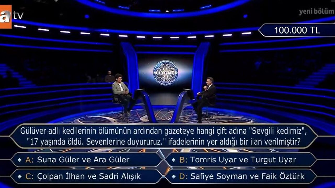 Yarışmada sorulan, "Gülüver adlı kedilerinin ölümünün ardından gazeteye hangi çift adına 'Sevgili kedimiz', '17 yaşında öldü. Sevenlerine duyururuz.' ifadelerinin yer aldığı bir ilan verilmiştir?" sorusunun doğru cevabı B şıkkı, Tomris Uyar ve Turgut Uyar'dır.
