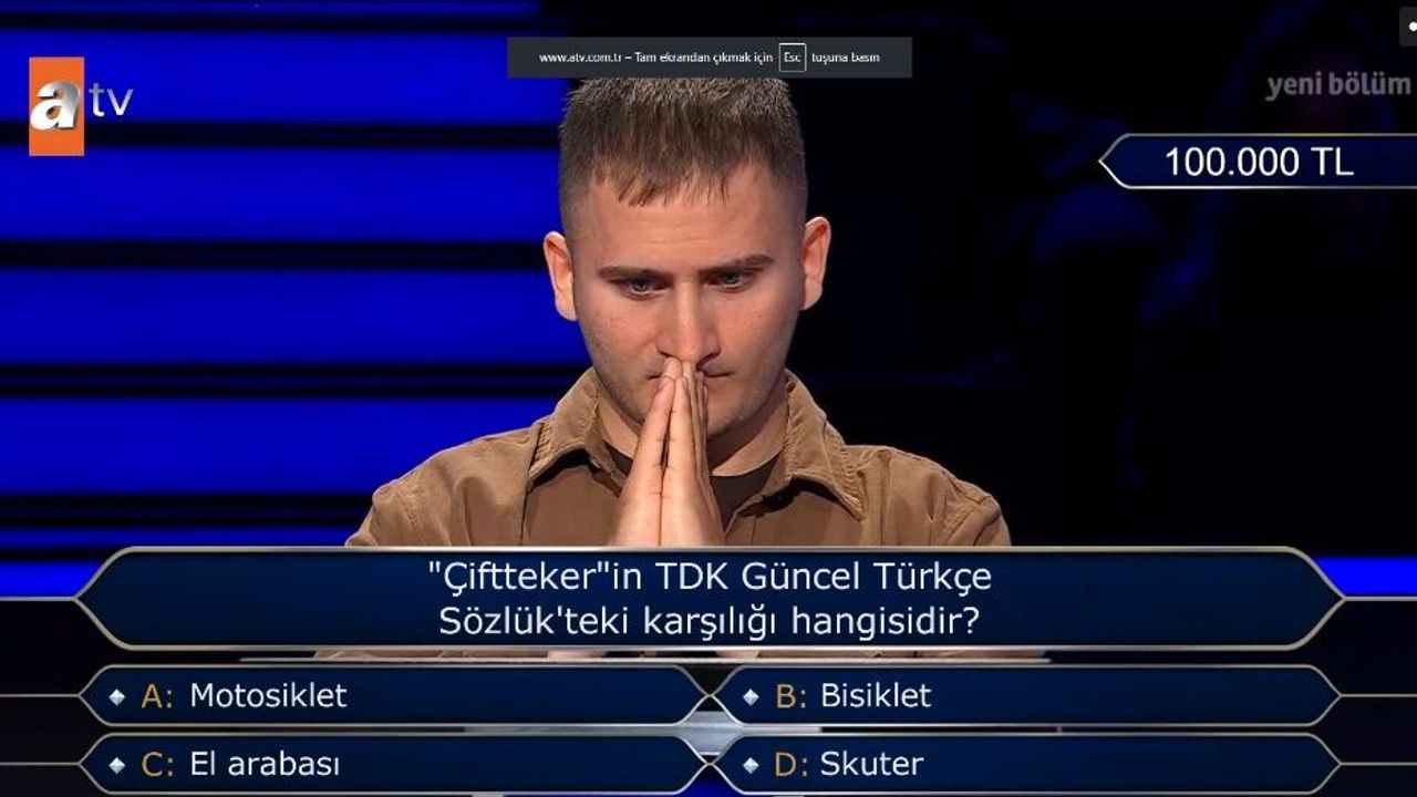 Kenan İmirzalıoğlu'nun sunumuyla ekranlara gelen yarışmanın yeni bölümünde, kelime bilgisi üzerine sorulan bir soru geceye damga vurdu. Yarışmacı, TDK Güncel Türkçe Sözlük'teki karşılığı üzerinden sorulan "çiftteker" sorusunda oldukça zorlandı.