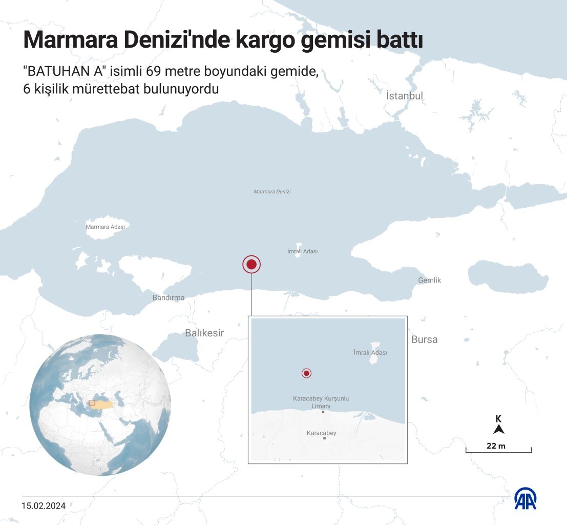 Kıyı Emniyeti Genel Müdürlüğünden yapılan açıklamada, Marmara Denizi İmralı Adası güneybatısında su alan "BATUHAN A" isimli 69 metre boyundaki genel kargo gemisi için Ulaştırma ve Altyapı Bakanlığı Kıyı Emniyeti Genel Müdürlüğüne ait KEGM-6 ve KIYEM-4 hızlı tahlisiye botlarının olay yerine ivedilikle yönlendirildiği kaydedildi.