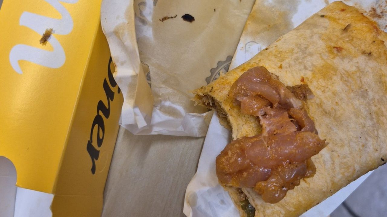 Söz konusu paylaşımda, dürümün iç kısmında tamamen pişmemiş tavuk parçalarının bulunduğu görülüyor. Kullanıcı, gönderisine eklediği açıklamada:
