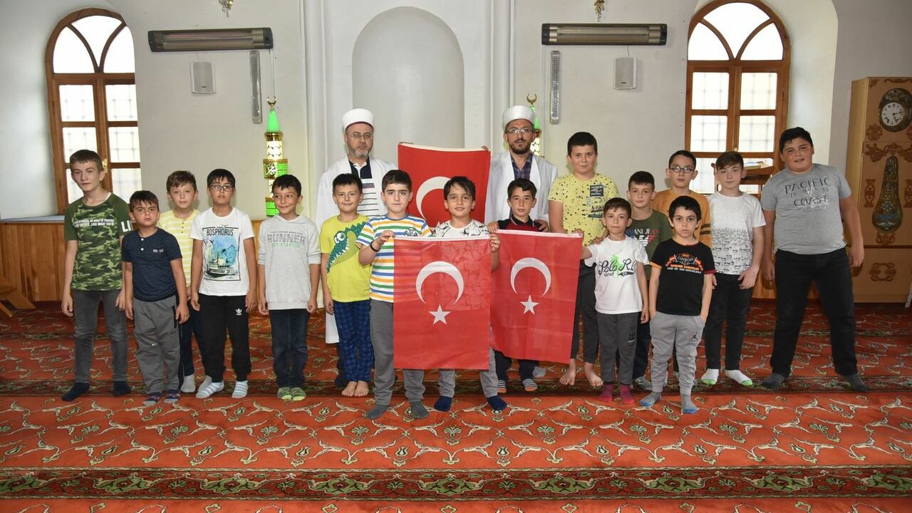Kahraman mehmetçiğe destek için cami'de bayrak açan öğrenciler, harekatta cansiparane çarpışan askerlere de selamlarını yolladılar.