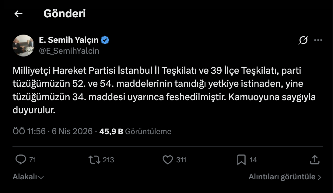 "Milliyetçi Hareket Partisi İstanbul İl Teşkilatı ve 39 İlçe Teşkilatı; parti tüzüğümüzün 52. ve 54. maddelerinin tanıdığı yetkiye istinaden, yine tüzüğümüzün 34. maddesi uyarınca feshedilmiştir."