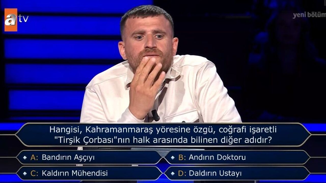 Yarışmanın son bölümünde, Kahramanmaraş yöresine özgü ve coğrafi işaret tescilli olan "Tirşik Çorbası"nın halk arasındaki lakabı soruldu. Gastronomi meraklılarını ekran başına kilitleyen o soru ve seçenekler şu şekildeydi: