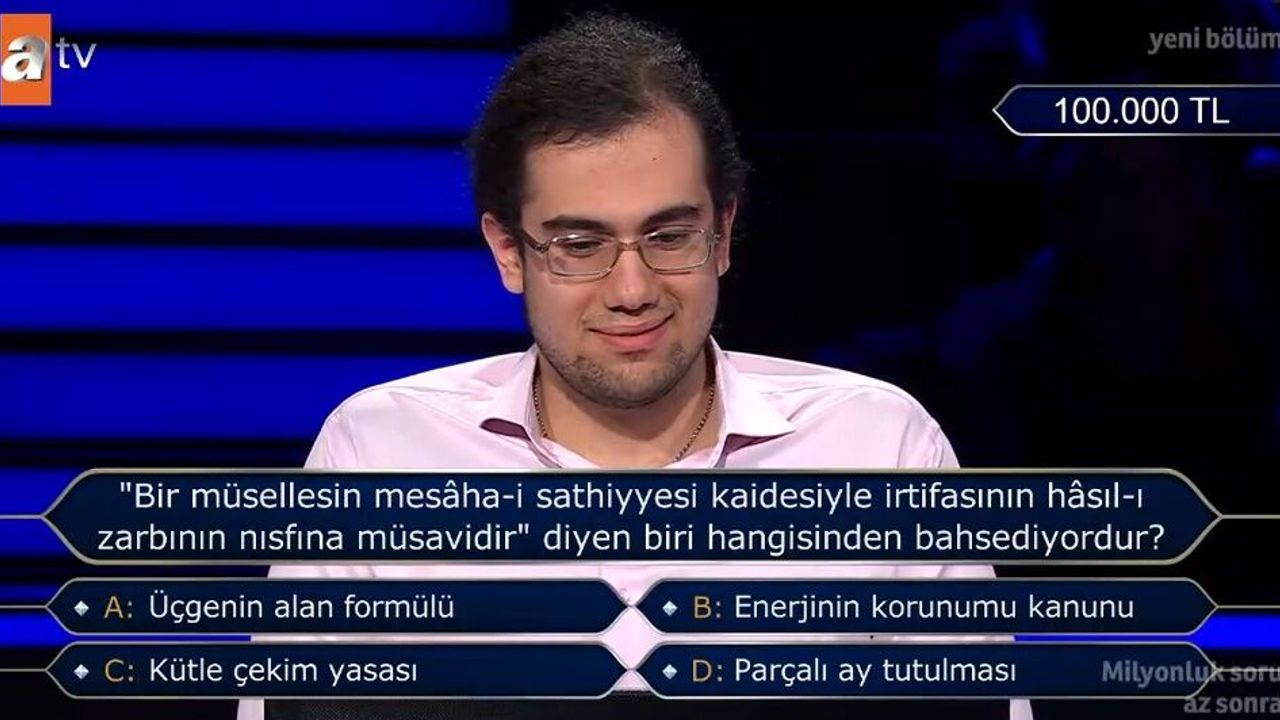Ünlü oyuncu Kenan İmirzalıoğlu’nun sunumuyla ekranlara gelen yarışmada, yarışmacının karşısına çıkan geometri sorusu sosyal medyada da kısa sürede en çok konuşulanlar arasına girdi. Soru, modern Türkçede her gün kullandığımız bir formülün eski dildeki karşılığını arıyordu.