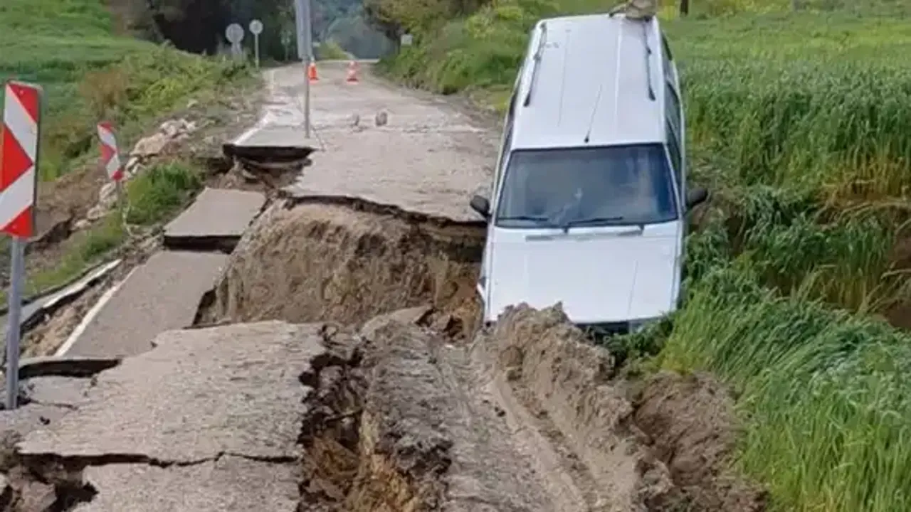 Yağışın yol açtığı sel ve su taşkınları nedeniyle bir köy yolunda meydana gelen çökme, ulaşımda büyük aksamalara neden oldu.