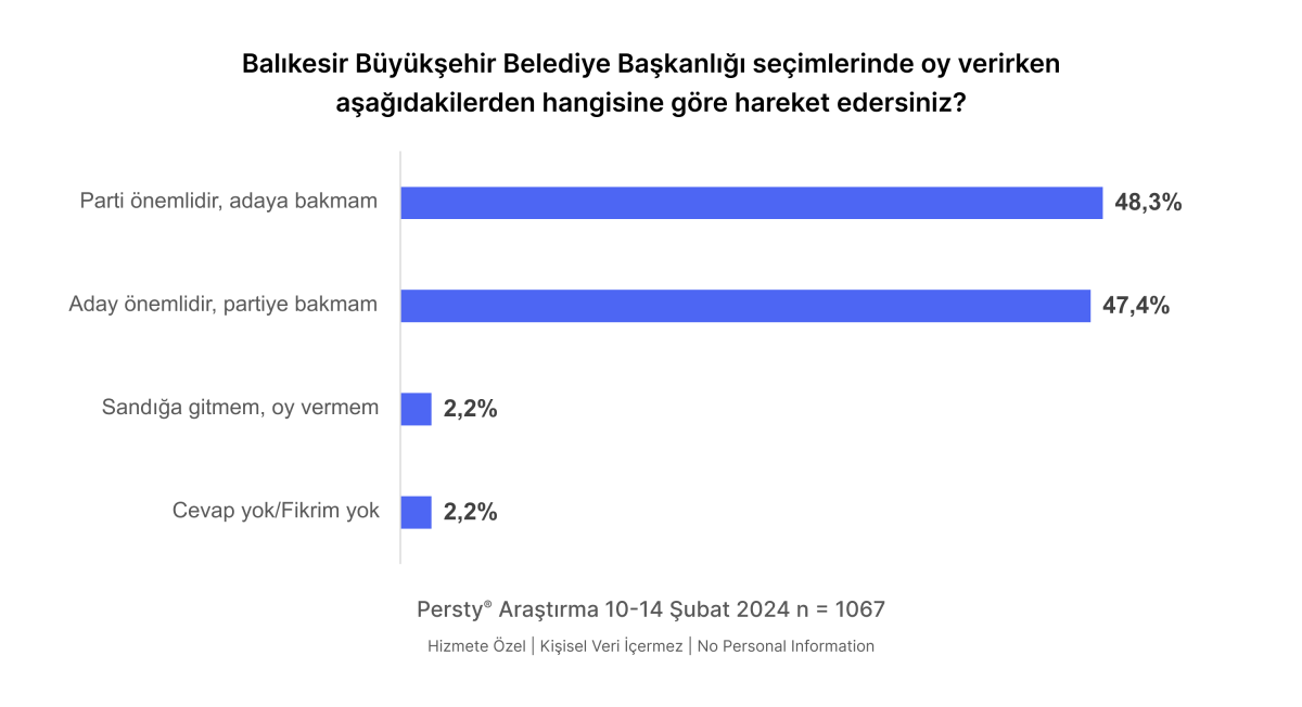 Katılımcıların %48,3’ünün “partiyi önemli gördüğü, adaya bakmadığı”, %47,4’ünün “adayı önemli gördüğü, partiye bakmadığı” belirlendi.