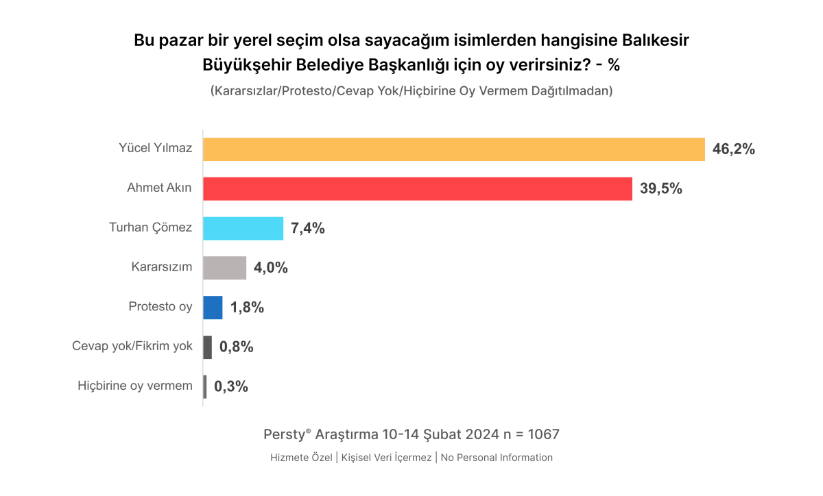 Balıkesir Büyükşehir Belediye Başkanlığı seçiminde katılımcıların oy tercihlerinin şu şekilde dağıldığı görüldü: Yücel Yılmaz %46,2, Ahmet Akın %39,5, Turhan Çömez %7,4. Kararsızlar, protesto oy, cevap vermeyenler ve hiçbirine oy vermem diyenler dağıtıldığında bu oranlar sırasıyla Yücel Yılmaz %49,6, Ahmet Akın %42,4 ve Turhan Çömez %7,9 olarak gerçekleşti.