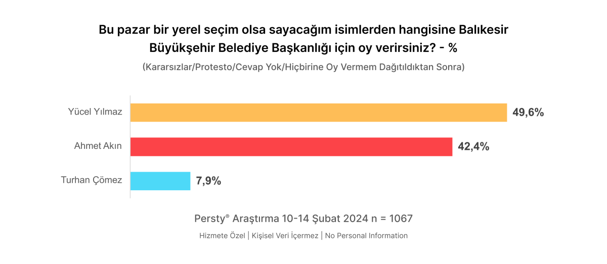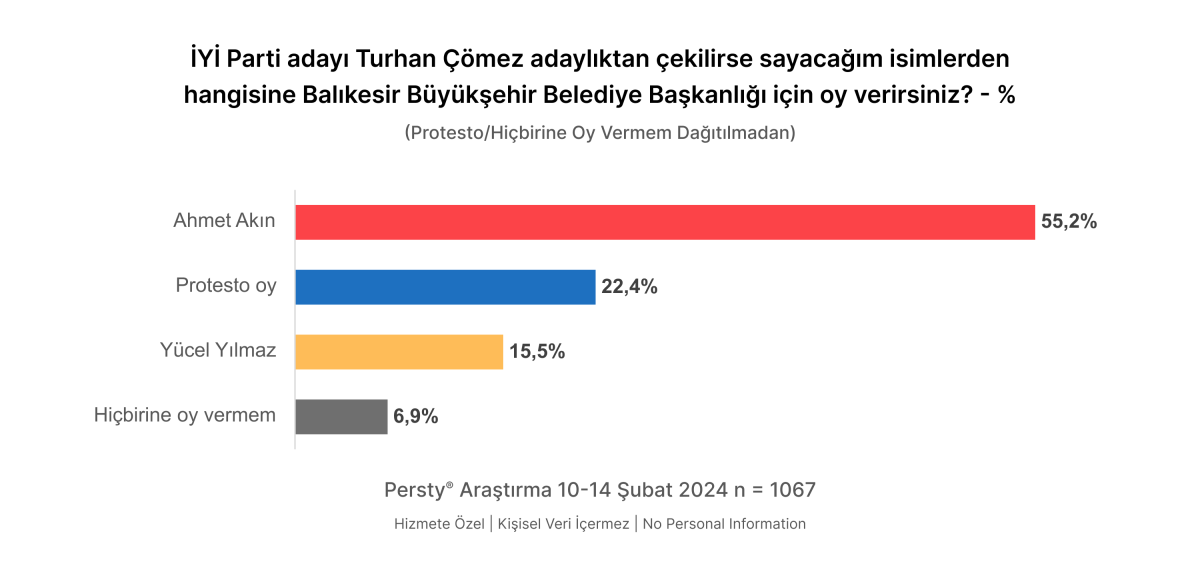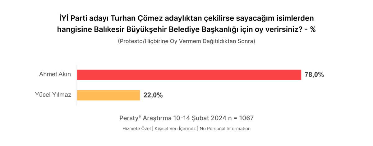 Turhan Çömez Adaylıktan Çekilirse İYİ Parti adayı Turhan Çömez’in adaylıktan çekilmesi durumunda bu adaya oy vereceğini söyleyen katılımcıların oy tercihlerini Ahmet Akın yönünde kullandıkları belirlendi. ARAŞTIRMANIN KÜNYESİBu rapora konu olan saha araştırması, Persty Araştırma tarafından, 10-14 Şubat 2024 tarihleri arasında, Balıkesir’de 18 yaş ve üstü yetişkin nüfusunu temsil eden 1.067 kişi ile hanelerde, CAPI (Bilgisayar Destekli Yüz Yüze Görüşme) yöntemiyle gerçekleştirilmiştir. Araştırmanın amacı, yerel halkın seçmen tercihlerini belirlemektir.