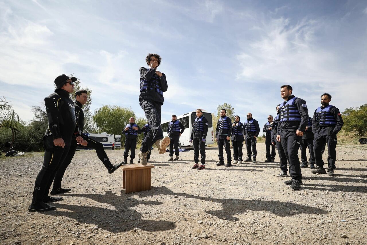 Eğitimlerin ilk haftasında teorik konuların yanı sıra "toplumsal olaylarda korunma", "yakın savunma" ve "suda hayatta kalma" uygulamaları yapıldı. Kesikköprü Barajı'nda dalgıç polisler tarafından suda hayatta kalma dersi alan kursiyerler, teorik eğitimin ardından baraj gölüne girerek görev esnasında suya düştüklerinde yüzme bilmemeleri durumunda dahi nasıl kurtulabileceklerine dair bilgilendirildi. Kış aylarında suya düşmeyle meydana gelebilecek hipotermi konusunda uyarılan ve buna yönelik detaylı eğitilen kursiyerlere suda hayatta kalma dersi verilirken ambulans ve balık adamlar da hazır bekletildi.