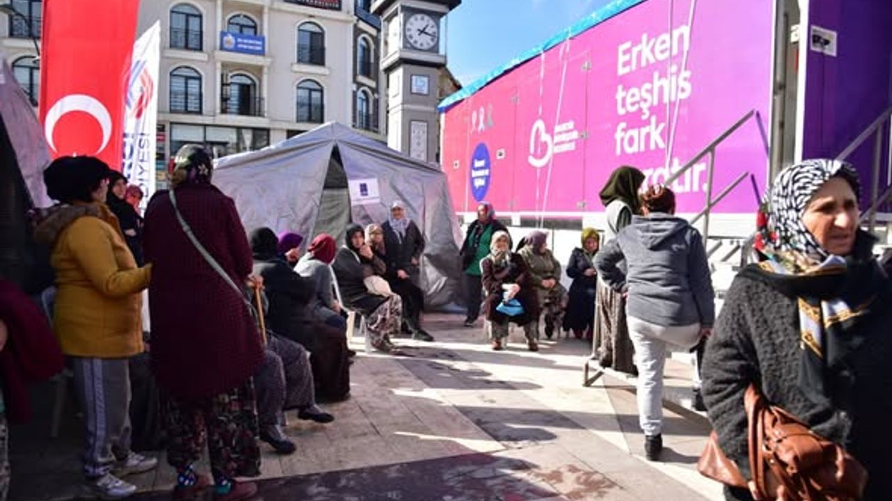 Kırsal mahallelerden talepte bulunan kadınların, Cumhuriyet Meydanı’nda hizmet veren Kanser Tarama Tırına ulaşımı belediye tarafından sağlanıyor.