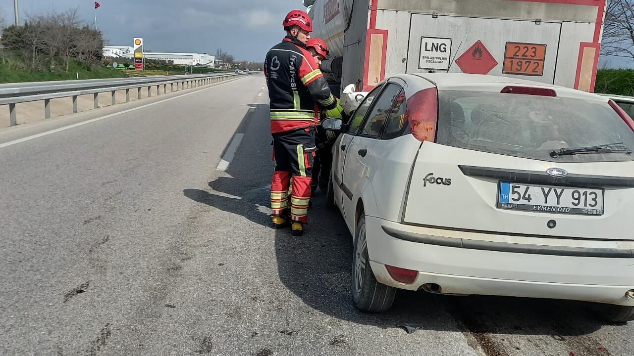 Edinilen bilgilere göre, 54 YY 913 plakalı otomobil, seyir halindeyken henüz belirlenemeyen bir nedenle önünde ilerleyen 34 AC 1227 plakalı tankere arkadan çarptı. Çarpmanın şiddetiyle otomobil büyük hasar alırken, araç içerisinde bulunan R.U. isimli vatandaşımız hurdaya dönen metal yığınları arasında sıkıştı.