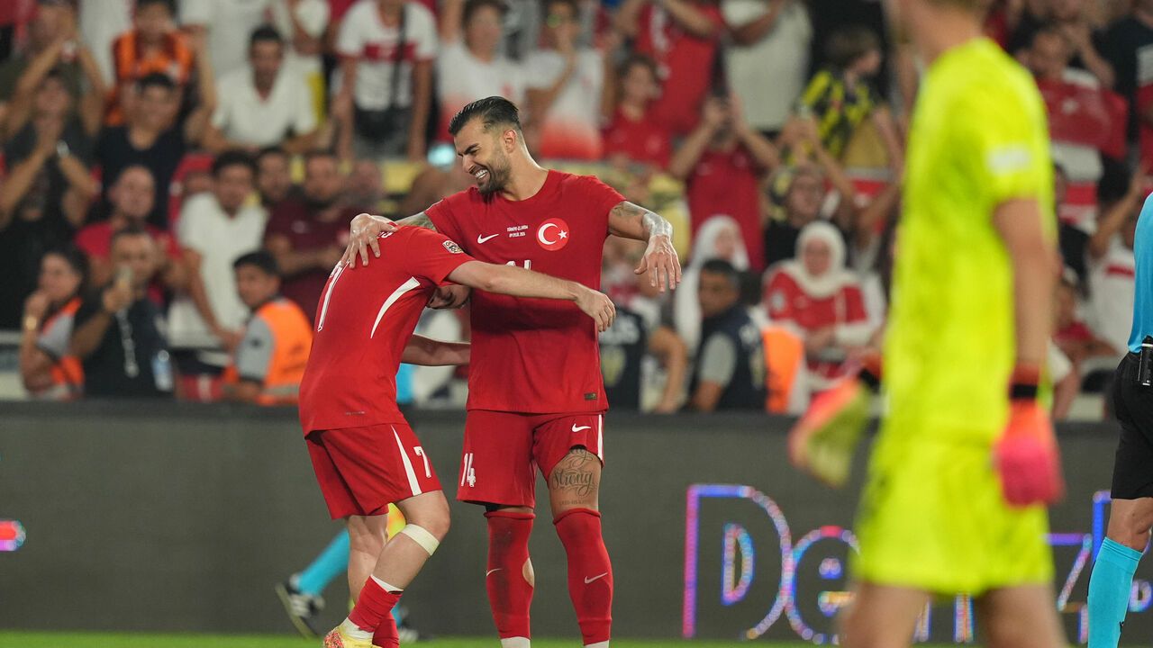 Müsabakanın ardından tribünleri dolaşan ay-yıldızlı futbolcular, galibiyet coşkusunu taraftarlarla paylaştı. Daha sonra orta sahada toplanan millilerden Kerem Aktürkoğlu, taraftarlara üçlü çektirdi.