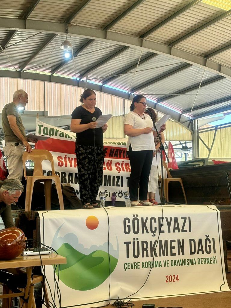 Türkmen Dağı Çevre Platformu adına, basın açıklamasını Gökçeyazı Türkmen Dağı Çevre Koruma ve Dayanışma Derneği Yönetim Kurulu Üyesi Dilek Yalçın ve Türkmen Dağı Çevre Platformundan Nursel Çakır okudu. Basın açıklamasında Yalçın ve Çakır, “Türkmen Dağı’nda, CVK Madencilik tarafından Balıkesir ilinin İvrindi ve Altıeylül ilçelerine bağlı en az 16 köyü etkileyecek olan bir Altın Madeni Projesi gerçekleştirilmek isteniyor. Proje, Türkmen Dağı’ndaki ormanlarımızı, Gökçeyazı, Sarıalan, Çamköy, Sofular ve daha pek çok köyün tarım alanlarını, meralarını ve hazine arazilerini yok edecek. Ruhsat Alanı 15 bin 627 dönüm, ÇED alanı ise 9 bin 133 dönüm. ÇED alanının 6 Bin 822 dönümü orman, 1.615,5 dönümü özel mülkiyet (tarım arazisi), 676,3 dönümü hazine arazisi, 19,5 dönümü ise mera statüsünde. Proje süresi 9 yıl. Proje kapsamında 2 adet açık ocak, 4 adet yeraltı galeri ocağı, kırma tesisi, zenginleştirme tesisi, atık barajı, pasa depolama alanları, bitkisel toprak depolama alanları, cevher stok alanları var. Açık ocak alanlarından birisi 170 metre derinliğinde ve Sarıalan köyünün evlerine yalnızca 250 metre mesafede. Atık Barajı, Gökçeyazı köyünün hemen yakınında, meralarının üstünde. 4 adet yeraltı galerisi ise tüm Türkmen Dağı’nın altını kaplıyor. Çamköy’ün evlerinin altında yeraltı galerisi var. Hem açık ocak, hem de yer altı galerilerinde susuzlaştırma yapılacak. Ayrıca hemen her gün patlatmalar yapılacak. Bu nedenlerle yer altı ve yüzey suları rejimi bozulacak ve sular kirlenecek.” dediler. “Proje ile ilgili kamuoyu oluşturmak için çok sayıda eylem yaptık, yapmaya devam ediyoruz. Kamu kurumları ile görüşmeler gerçekleştiriyoruz. Balıkesir Büyükşehir Belediyesi’ni, Altıeylül Belediyesi’ni, Odaları, Baro’yu ziyaret ettik. Köylülerimizin de yer aldığı bir heyetle Vali yardımcısıyla görüşüp çalışma ruhsatının iptalini talep ettik; kurumsal ve bireysel dilekçeler verdik. Dilekçemize henüz yanıt alamadık. CİMER üzerinden de dilekçeler vermeye başladık. Change.org’da da imza kampanyası başlattık. Balıkesir Büyükşehir Meclisi, araştırma komisyonu kurulması için karar aldı. Komisyonda yer almak için başvurumuzu yaptık. Standlar açıp yurttaştan imza topluyoruz. Islak imza sayımız 10 bin’e ulaştı. Köylerde bilgilendirme toplantıları düzenliyoruz. Mücadelemizi çevre STK’larının, Odaların ve köylülerin yer aldığı “Türkmen Dağı Çevre Platformu” olarak sürdürüyoruz. Bu arada, Gökçeyazı Türkmen Dağı Çevre Koruma ve Dayanışma Derneği’nin kuruluşu da gerçekleştirildi ve bugün açılışını da yaptık.” diyerek sözlerini tamamladılar.